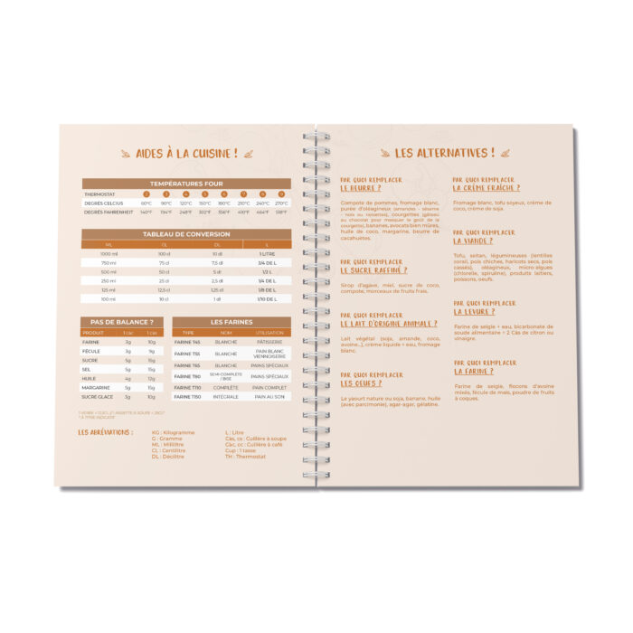 Ce livre de recettes n’est pas seulement un carnet à compléter mais il te livrera également quelques astuces : des aides à la cuisine, une table de conversions, des alternatives aux intolérances… d’ailleurs savais-tu qu’il est possible de remplacer le sucre raffiné par du sirop d’agave, du miel ou encore du sucre de coco?